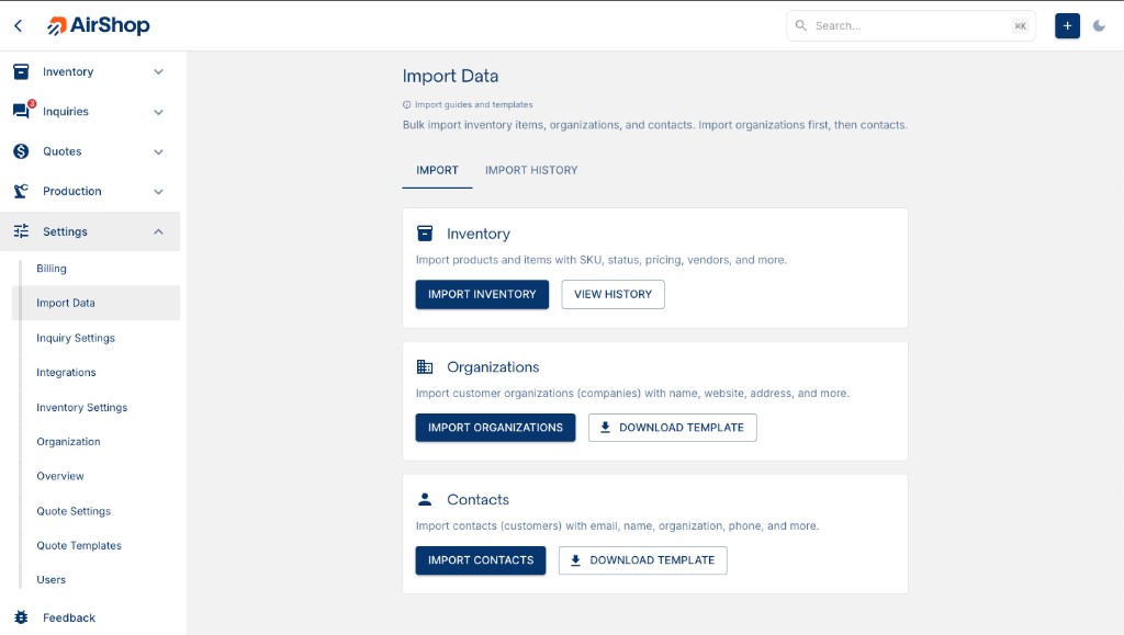 Bulk import lets you add or update many records at once by uploading CSV or Excel files. All imports are available from Settings → Import Data at airshop.work/import.